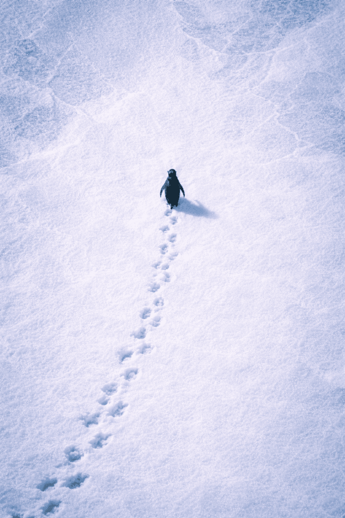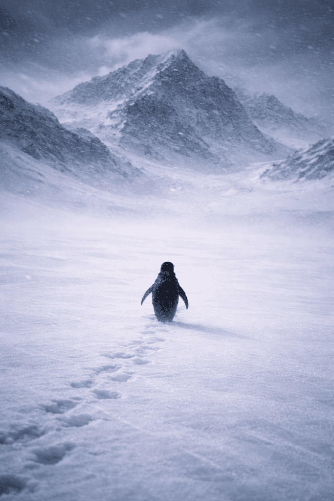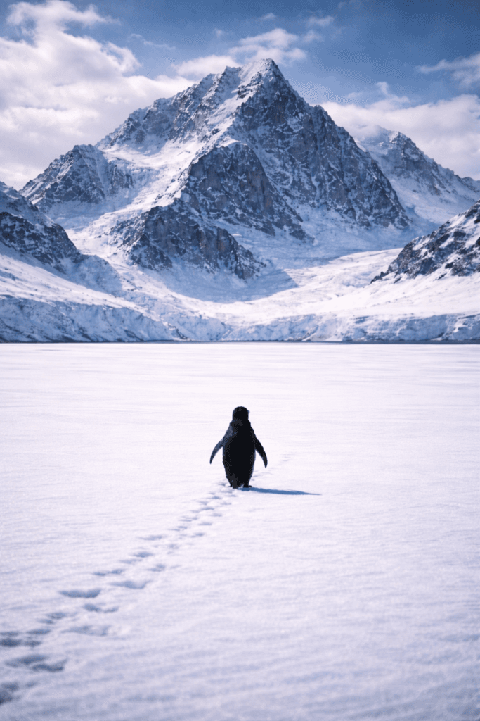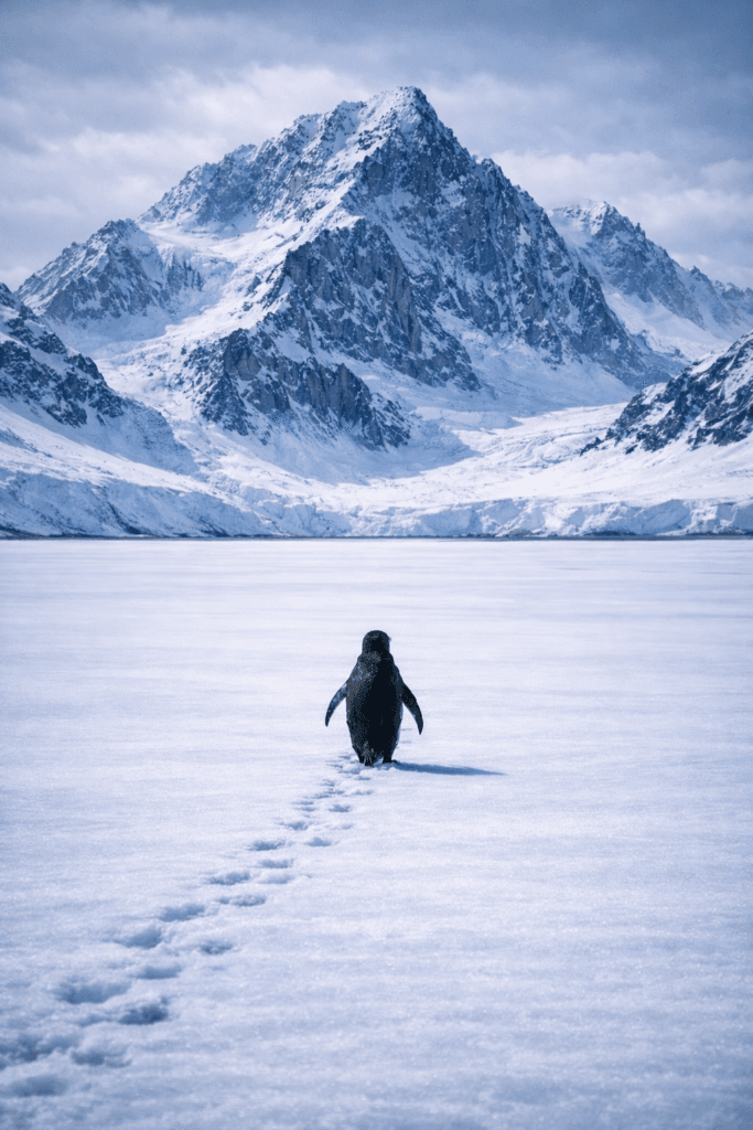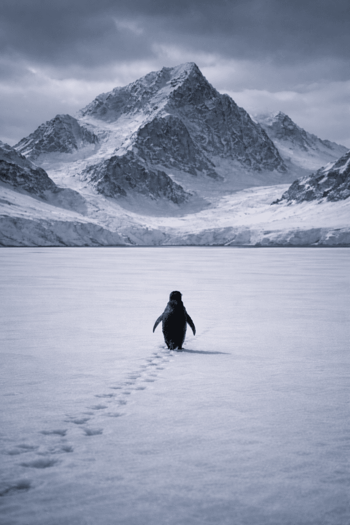 - Minimalist Estetik: Buzullarda yürüyen yalnız penguen görüntüsü, güçlü bir görsel metafor sunuyor
